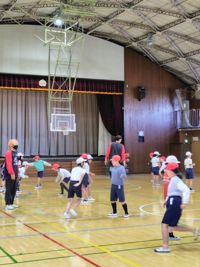 先日の6年生に続いて、今日は5年生が各クラスごとに「東京八王子ビートレインズ」のみなさんと一緒にバスケットボールの学習をしました。