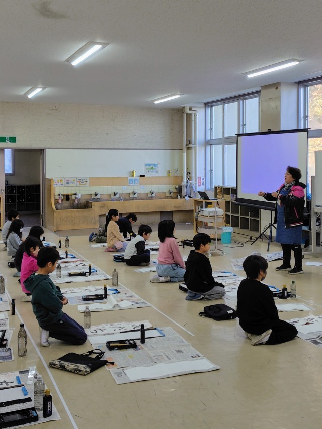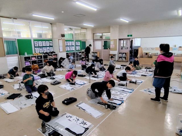 3年生もオープンスペースで順番に書き初めの練習です。お題は「友だち」です。今年から毛筆を学習している3年生。もちろん毛筆の書き初めも初めてです。