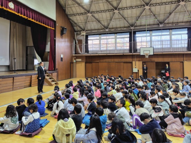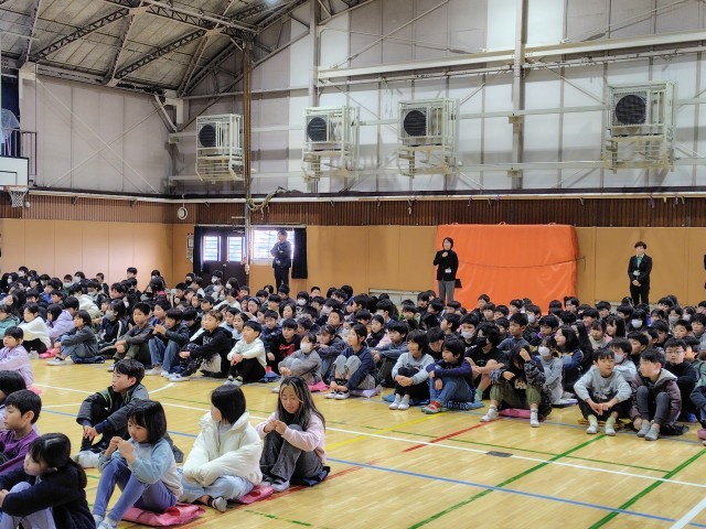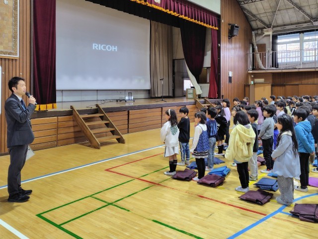 さあ全校児童が体育館に集合して終業式を始めます。市内は依然としてインフルエンザが流行していますが、無事に終業式を迎えられてほっとしています。