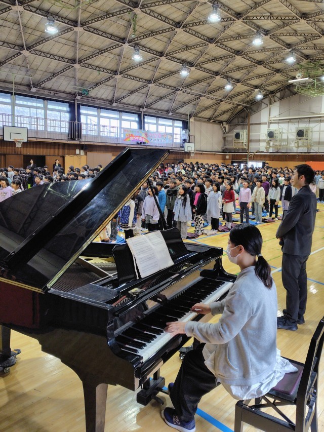 (副校長先生の司会です。校長の話の後は、全員で校歌を歌います)