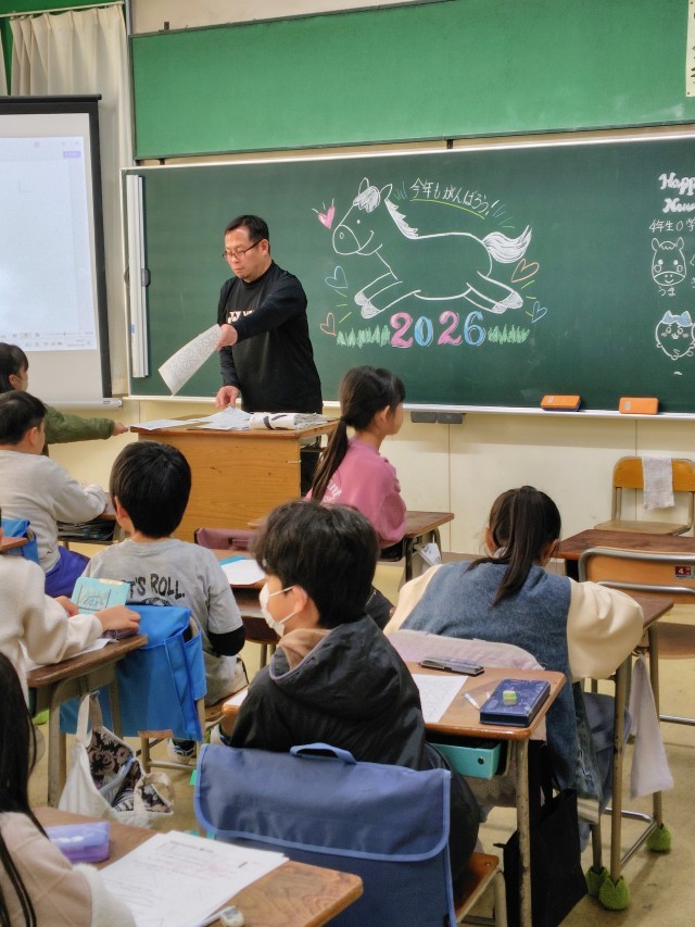 (黒板にはかわいらしい馬の絵。今年は午年(うまどし)ですね)