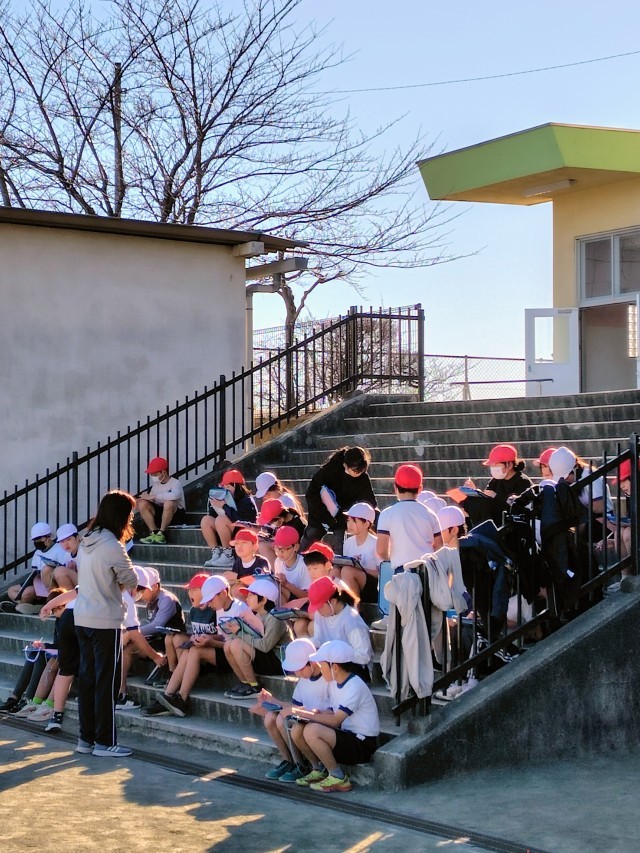 (長縄跳びで体を温めてから、走り幅跳びをします。体育の学習カードを記入しながら、自分の目標を確認します)