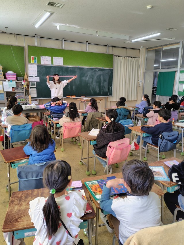 「100cmをこえる長さ」の学習です。先生が100cmに切ったテープを見せてくれました。今日のめあては「100cmをこえるものをさがそう」です。
