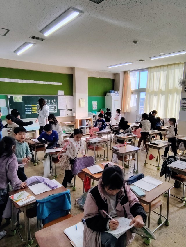 (先生がお隣同士にテープを配ります。教室の中で100cmを超える長さを一緒に見つけてみよう)