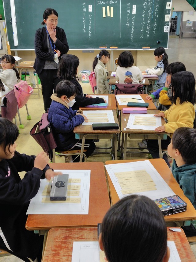 (おもちゃを考えたグループごとに、その遊び方を説明するメモを作るのです)