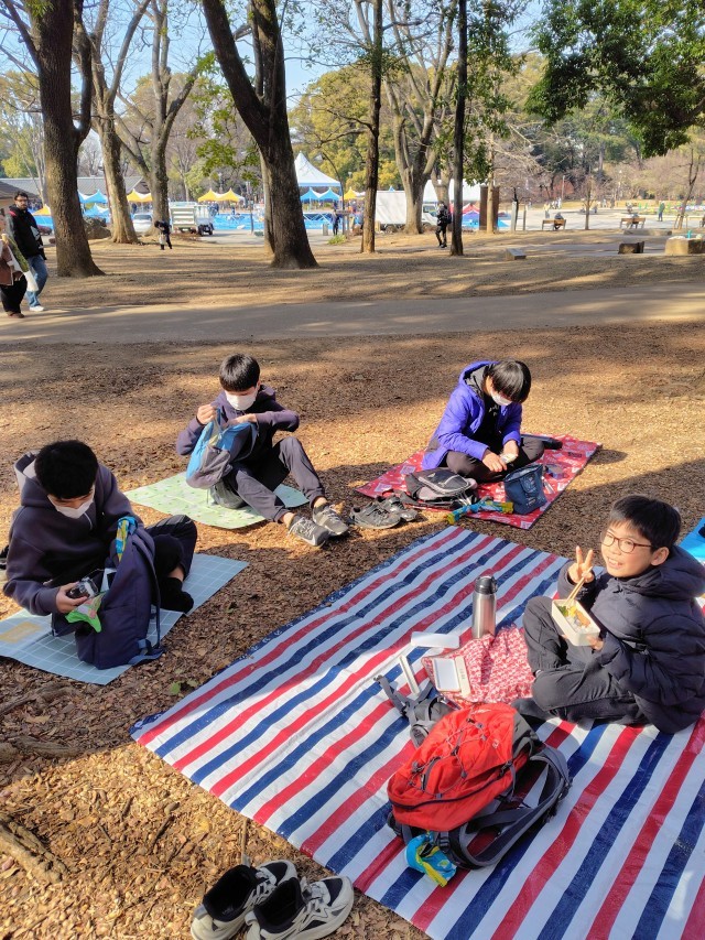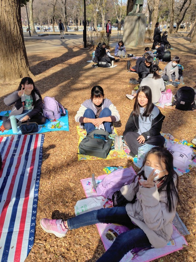 (バスで上野の森へ。次の見学先、国立科学博物館の前の広場でお弁当タイムです)