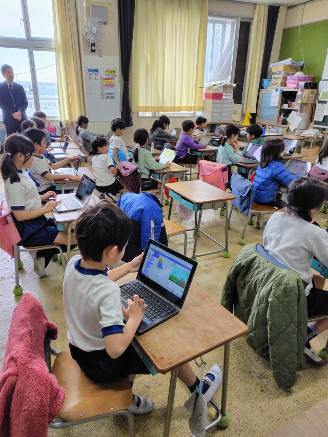 小宮小学校はプログラミング教育にとても力を入れています。2年生から始めて、毎年3年生から6年生までの多くの児童がプログラミングコンテストへ応募するまでに上達していきます。