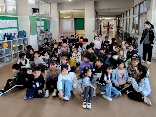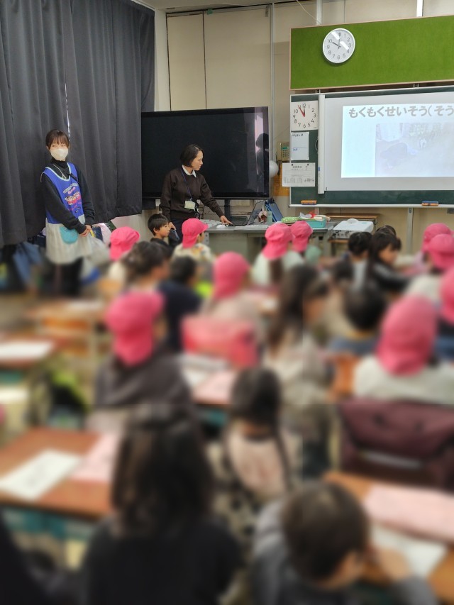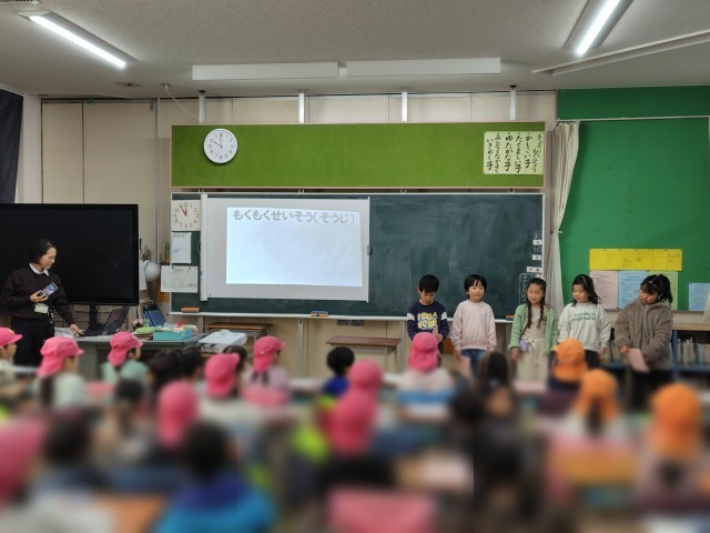 1年生がオープンスペースで保育園のみなさんを出迎えます。今日は毎年行っている交流会の日です。ひなた保育園、多摩こばと保育園、わらべ宇津木台保育園の年長さんたちが来てくれました。