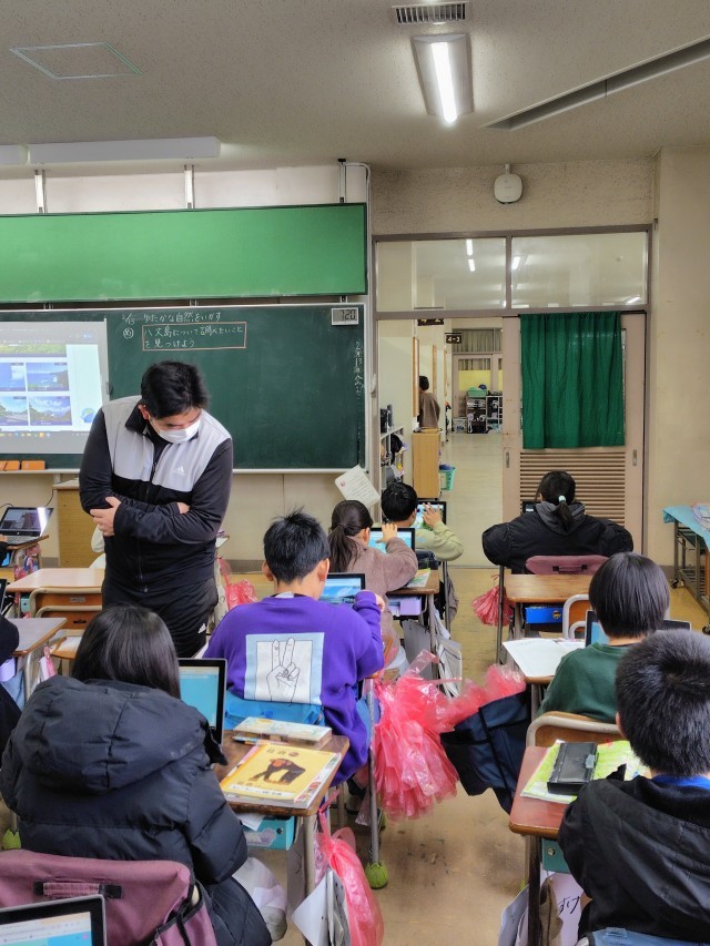(タブレットを使って八丈島を探検します)