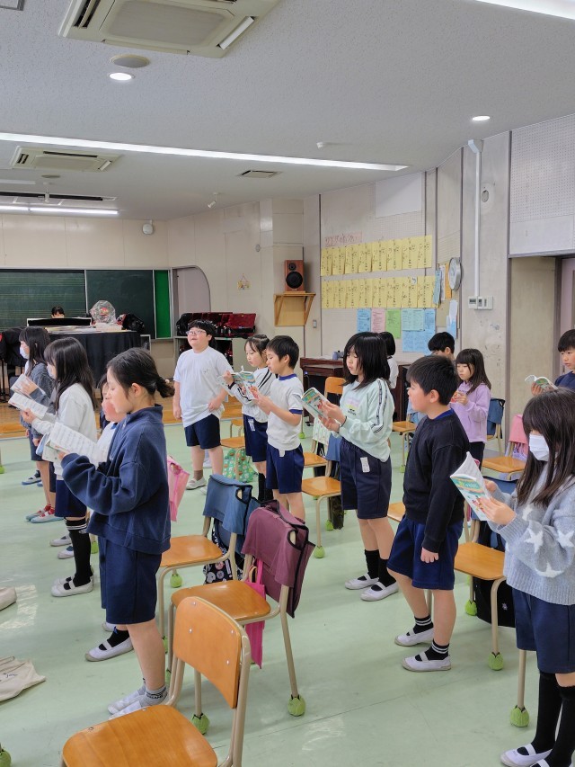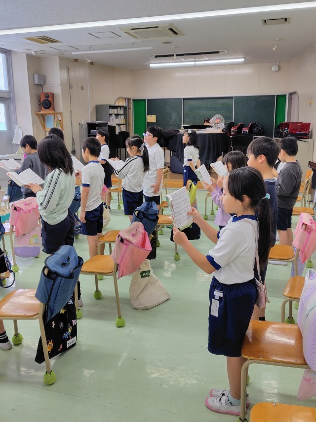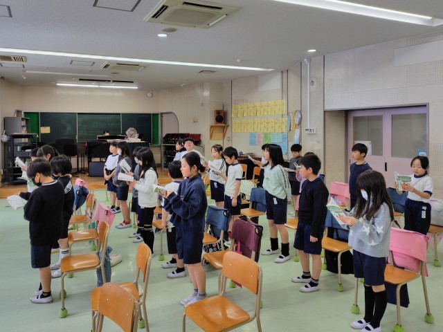 「旋律の重なりを感じとろう」という学習です。「歌おう声高く」という曲を歌いながら、重なり合う音の響きを体験します。
