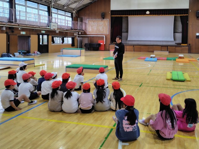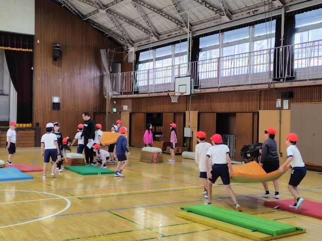 1時間目の体育館です。子どもたちが協力しながらテキパキと跳び箱やマットを並べています。いろいろな形に組み合わせています。