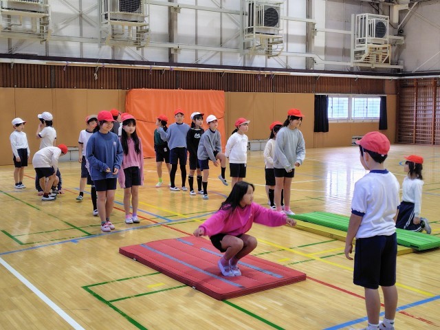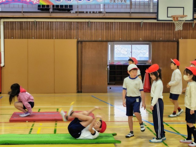 (「台上前転」の学習です。まずは、普通に前転の確認から始めます)