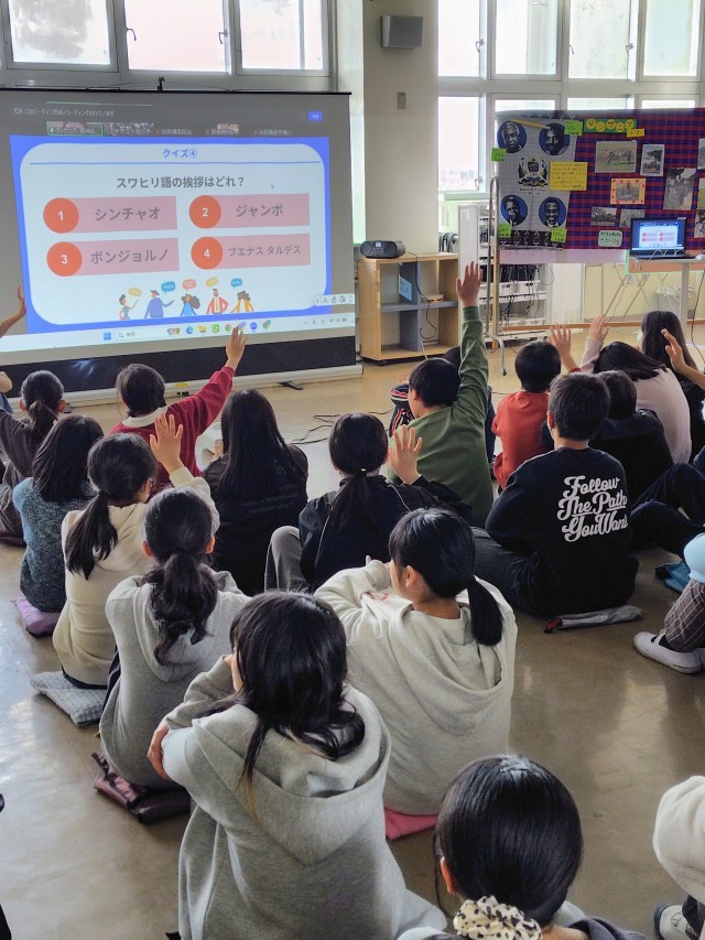 6年生がオープンスペースに集まっています。今日はアフリカのタンザニアの小学生とオンラインで交流します。まずは現地の日本人の方から、タンザニアについていろいろと解説していただきました。