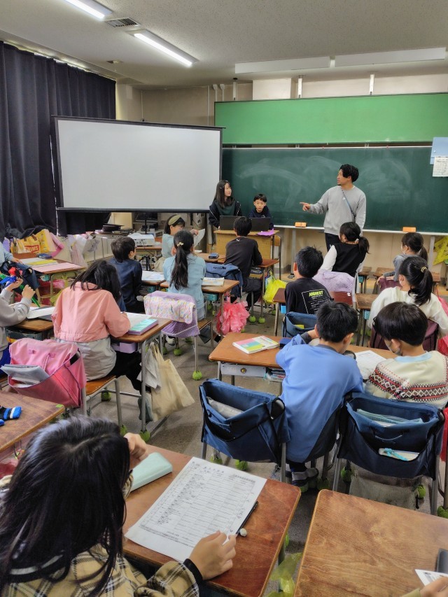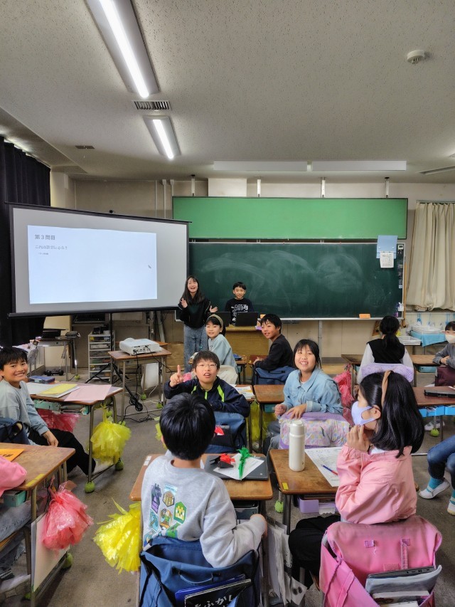 クラスの係活動のようです。クイズ係がとても楽しいスライドを作ってみんなを楽しませています。私にも優しく問題を出してくれました。