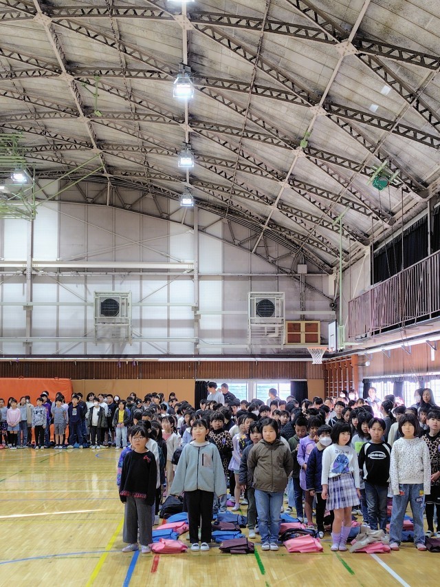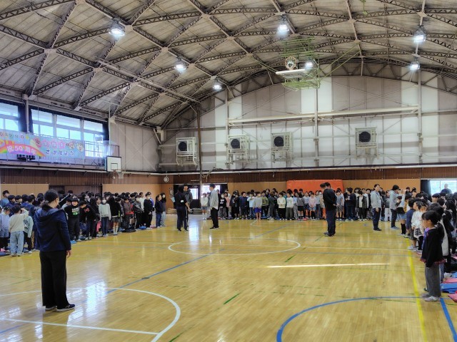 来週月曜日の「6年生を送る会」で歌う合唱曲の練習をしました。1年生から5年生までが体育館に集まりました。いつもの並び方とは違います。