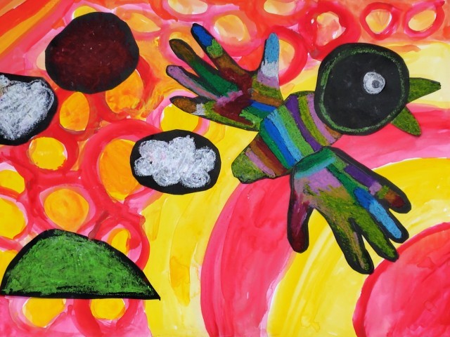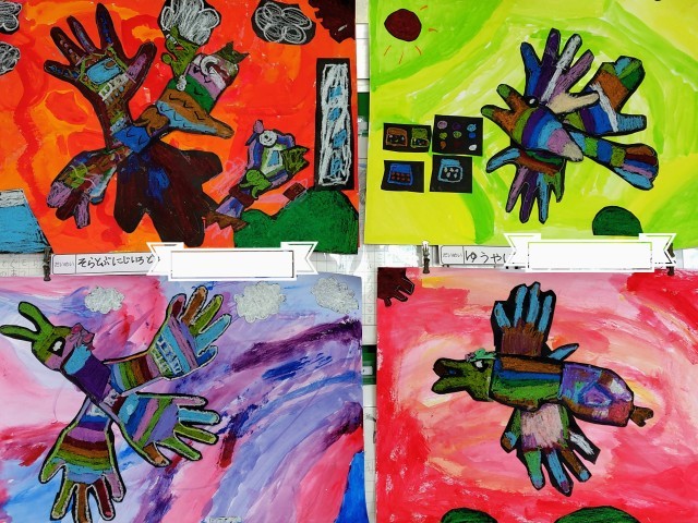 保護者会期間中、各階のオープンスペースで行われている平面作品展です。ほんの一部ですが各学年の様子を紹介いたします。1年生は「イロトリドリ」です。