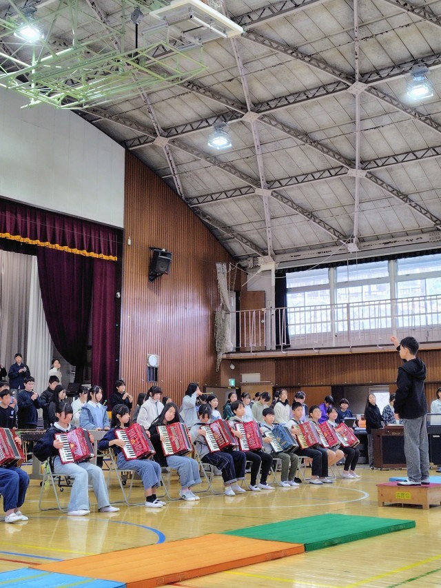 (組体操でバックに流れていた曲を合奏。在校生が見つめます)