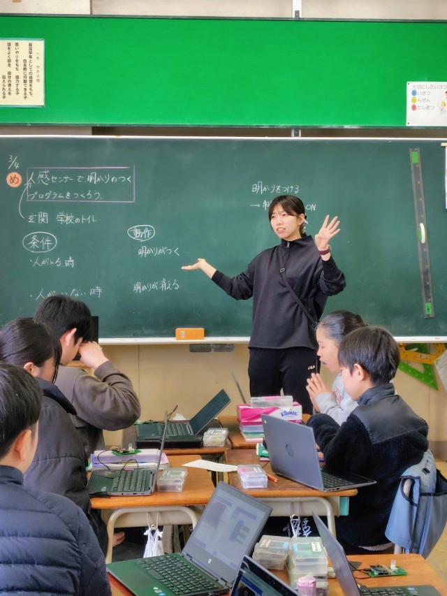 (人感センサーによる点灯が設定できたら、次は気温によって違うマークを表示するように設定してみましょう。教室の中と外で違う反応をするか確かめます)