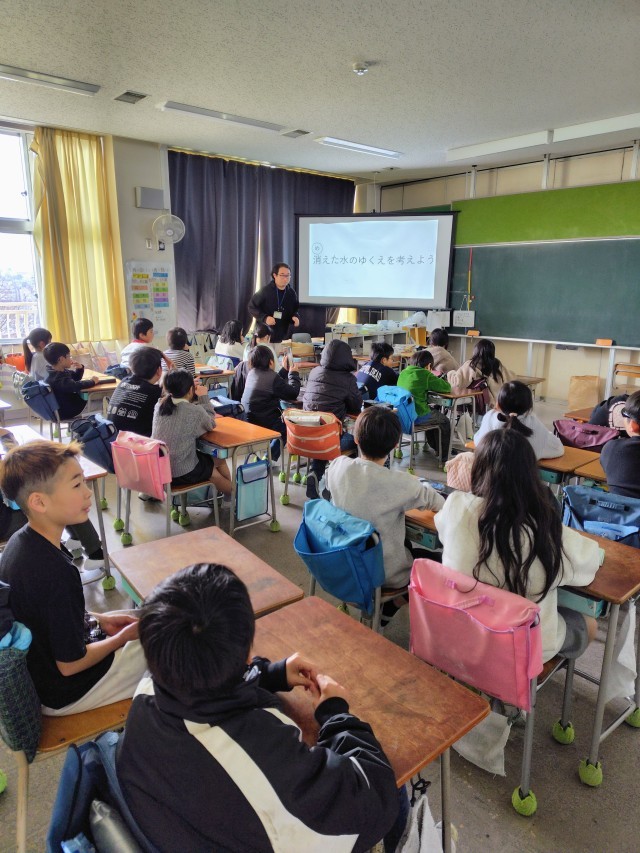 「水のゆくえ」の学習です。雨上がり、水たまりの水がいつの間にかなくなっているのはなぜだろう。教室の後ろにある水槽の水がだんだん減っていくのはなぜだろう。