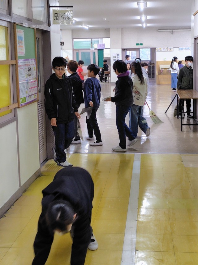 (5年生も大掃除のようです。黒板も廊下の床も、ピカピカ光っています)