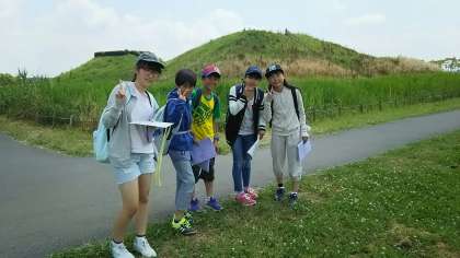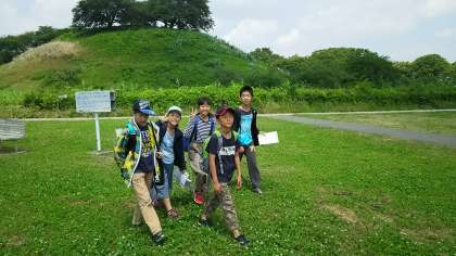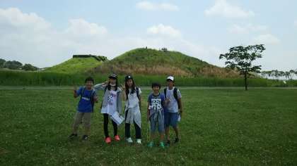 今、古墳群んグループ毎に見学中です。気温が上がり暑くなってきました。