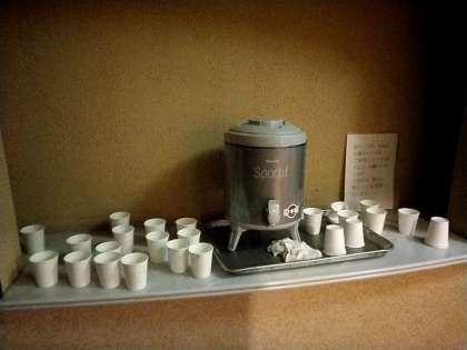 上の写真は、子どもたちに用意してくださったお茶です。コップは一人1日一つです。子どもたちの水分補給に大活躍してくれました。下の写真は、ある男の子の部屋です。ナイトハイクの時にもらった御札がドアのところに貼ってあります(^^)