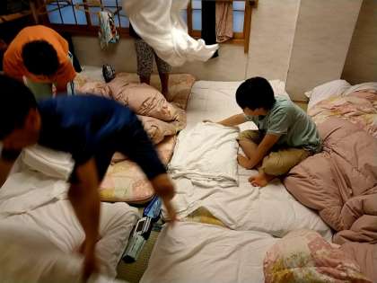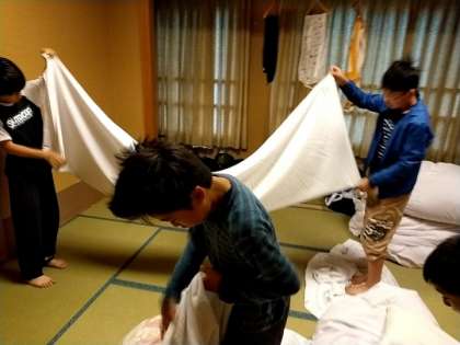 「まだ眠い…」と言うことです。それでも小宮小の子どもたちは、さすがです!すぐに気持ちを切り替えて、早速、布団たたみを始めました。みんなで協力してがんばっているところが、とてもいいですね!