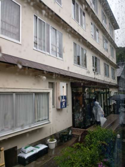 9時10分。お世話になったホテル山月をあとにしました。ホテル山月の皆さんには、子どもたちが、閉校式をしている間、子どもたちの荷物をバスに入れてくださいました。また、かっぱを着て、お見送りに沢山のスタッフの方が出てくださいました。