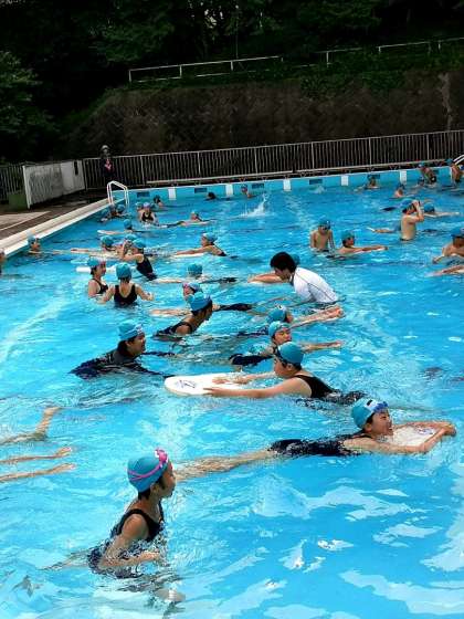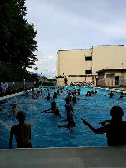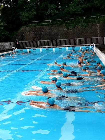 6年生も今日が今年最初のプールです。最初に水慣れで久しぶりの感覚を得たあとに、ペアで平泳ぎの足の学習をしました。