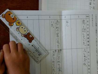 今日は、場面場面の主人公の気持ちを考えました。主人公は、「ゆうた」という男の子です。物語の中に登場する女の子と対比して、ゆうたの気持ちを考えていました。
