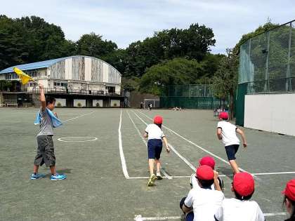 5年生は1クラスずつ体育で50メートルを測りました。高学年らしく準備も体操もてきぱきとすすめ、記録やスタートも子供たちでやっていました。