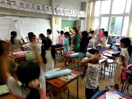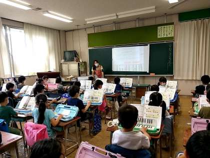 たくさんの子どもたちが、休み時間から弾いていて、嬉しい気持ちが伝わってきました。授業では、まず校歌を歌い、次に「ぼくらの八王子」を歌いながら踊り(笑)、その後鍵盤ハーモニカを行いました。