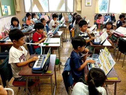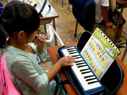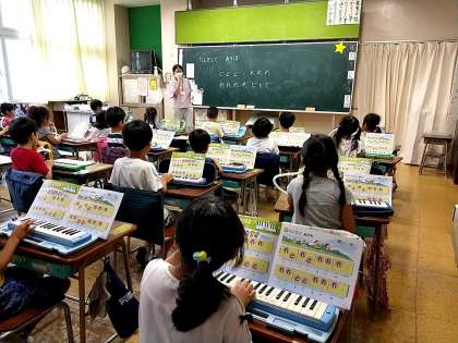 1年生の音楽です。今日、紹介するクラスは鍵盤ハーモニカのタンギングに気をつけて演奏する学習をしました。まず、演奏する曲の指遣いだけを練習します。次に「トゥー、トゥー」とタンギングで歌ってみます。最後に鍵盤ハーモニカで演奏してみます。