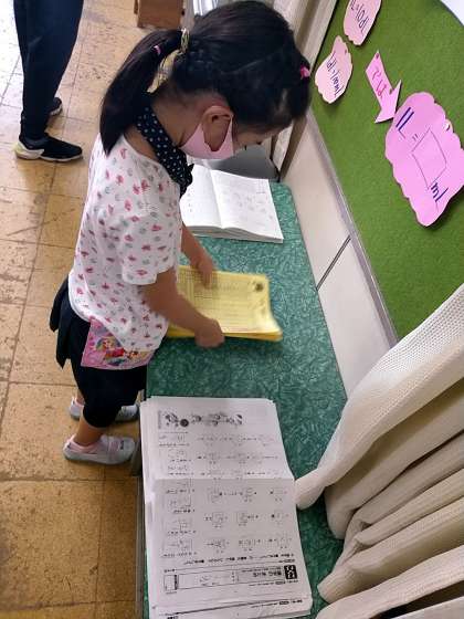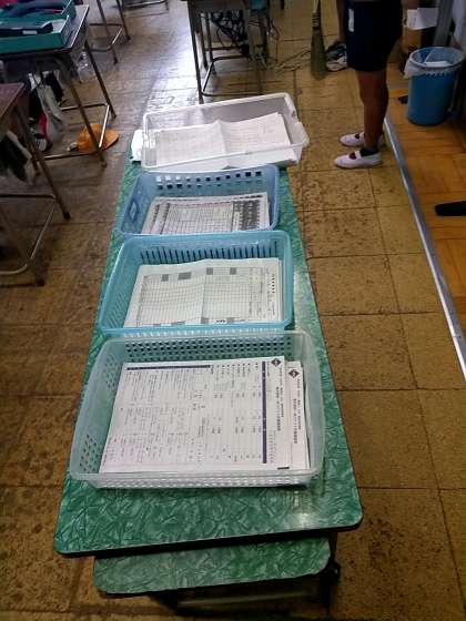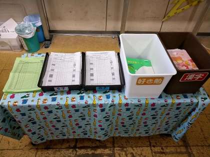 子どもたちは、教室に到着するやいなや、提出物をランドセルから出して提出します。急いで出すので、つい、散らかってしまいがちなのですが、散らからないように工夫しているクラスがあったり、提出物をていねいに揃える係のあるクラスもありました。