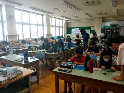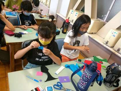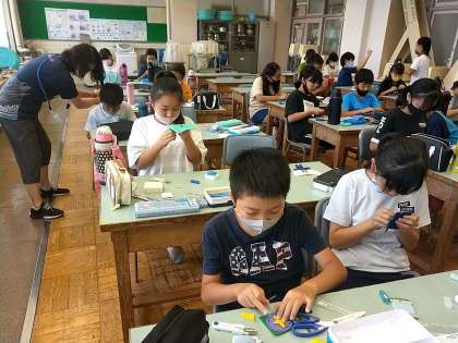 5年生の家庭科は「ソーイング」です。玉結び、玉どめを乗り越えた子どもたちは、フェルト生地を使って小物入れ作りを始めました。