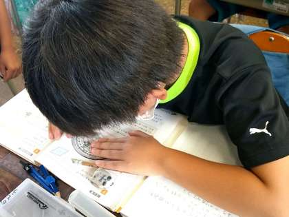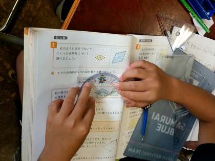 と言いました。そこでまず角度を測ることにしました。角度を測るのは分度器ですが、分度器の使い方がおぼろげて、ひし形の角度を測るのはなかなか難しい子もいました。でも、わからなくなったら、またやればいいのです!ポジティヴな考え方で進めていきたいと思っています。