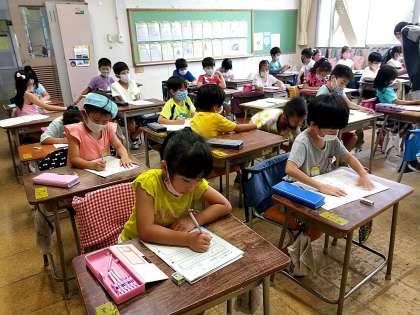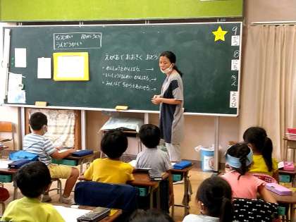 今日の1年生の1つのクラスでは、学級活動として、「運動会のめあて」について考えました。まずは、学年学級の目標を確認しました。「えがおで大きくおどろう」です。