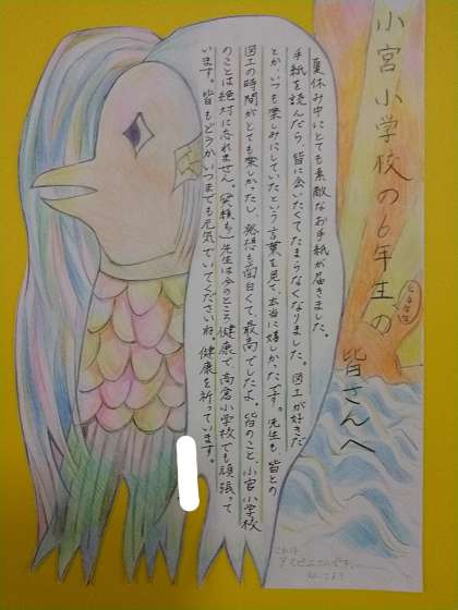 そこで昨日はまず図工の先生からのお手紙を読みました。読んだ後に、挿絵が書かれてあったので、それを紹介したくて次のように言いました。