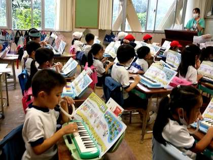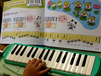 1年生の1つのクラスでは、音楽の授業を行いました。そして、鍵盤ハーモニカの学習では、「かえるのうた」を練習しました。