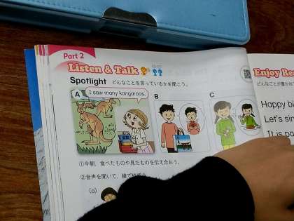 教科書の挿絵を見ながら、その行動を英語でTALKしました。