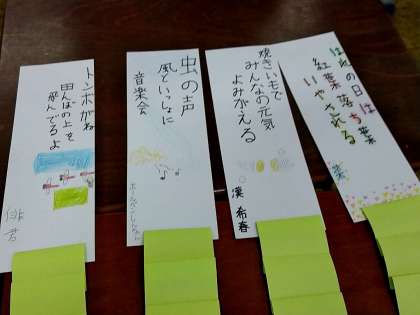 子どもたちが、まず俳句を作り、それを台紙に書いて、色も塗りました。