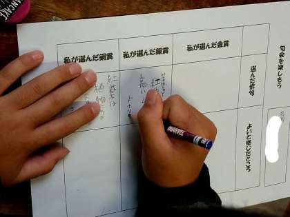 子どもたちは、みんなが作った俳句を読みながら、いいなと思うベスト3を選び、金銀銅賞として学習シートに書きます。もちろん選んだ理由も書きます。ここがポイントですね。