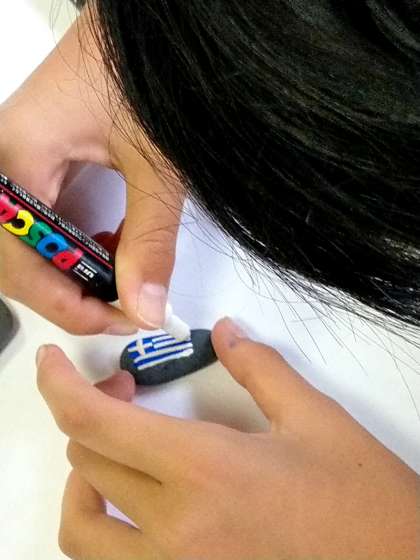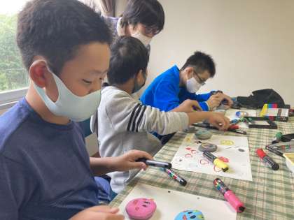 朝ごはんの後は、2つのチームに分かれて活動をしています。そのうちの一つがストーンペインティングです。海の石に思い思いの絵を書いて、バッヂやおもしを作ります。