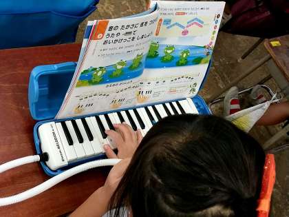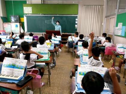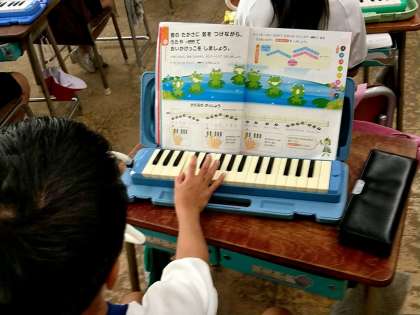 2年生の1つのクラスでは、音楽の時間に「かえるのうた」を鍵盤ハーモニカで演奏をしました。