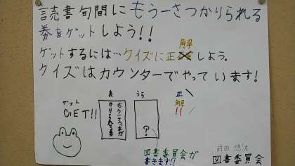 この100冊という目標をこの子が持ったのは、図書委員会の取り組みのおかげです。オープンスペースの掲示板に取り組みの内容が貼ってあります。