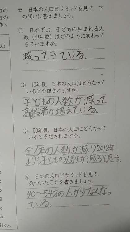 そして、グラフを書くだけでなく、そこから50年後の日本の未来の人口を考えるという課題が出されていました。