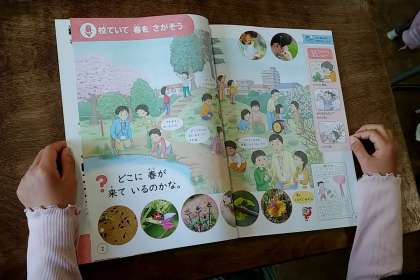 今日は時間がなかったので、実際に春を探しに行くことはできませんでしたが、教科書の絵を見て、どこにどんな春があるのかを考える学習をしました。