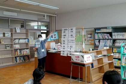 今日の4年生の1つのクラスでは、図書室で図書室ガイダンスを図書司書の方から受けました。