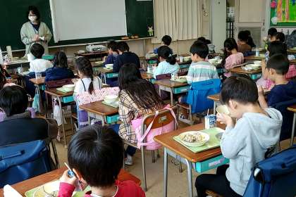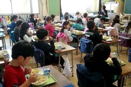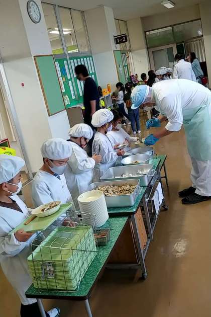 今日も給食の話題です。今年の1年生は2クラス。35人と34人で教室には余裕がありません。そこで1年生は、オープンスペースで配膳をすることにしました。これなら余裕をもって配膳ができます。配膳は、本当にありがたいことに給食室の方もお手伝いをしてくださり、今のところ、こぼす子も一人も出さないで配膳ができています。