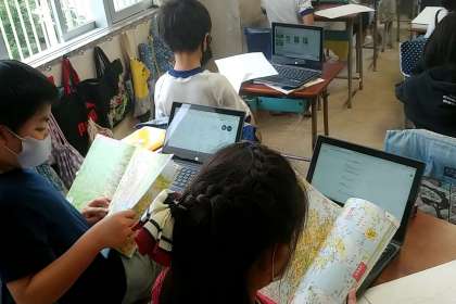 子どもたちは、上手に地図帳とパソコンを使い分けていました。